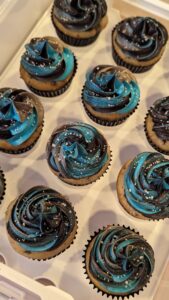 I went with a vanilla cupcake and an american buttercream. Normally I would use a swiss meringue buttercream for cupcakes, but I find that it never holds really vibrant colours as well as american, and for this I wanted them bright and strong. I made two batches of buttercream - one with the black cocoa, and one plain batch, which I divided into three and coloured with two shades of blue, and purple.