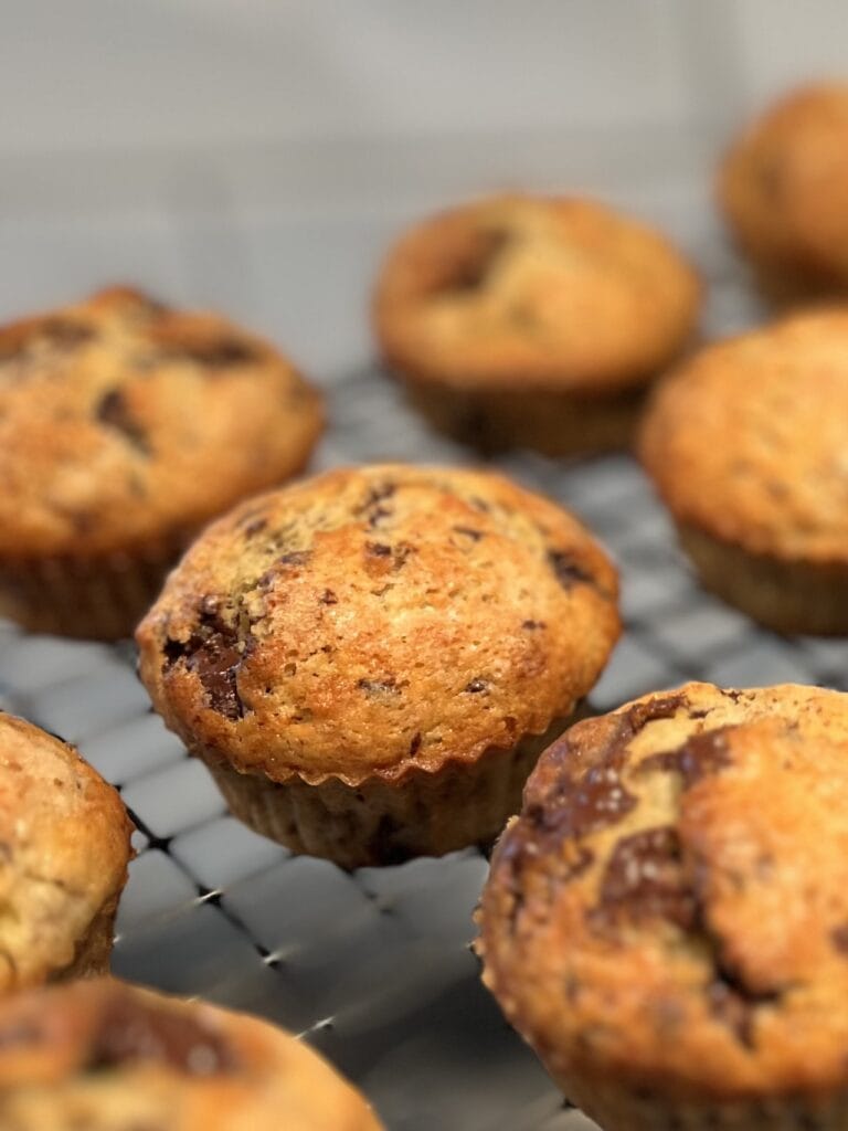 Banana chocolate chip muffins are amazing fresh on the day that they are made, but if you are eating them after that, I recommend either quickly zapping them in the microwave to refresh them, or if you're feeling spicy, split them in half vertically, butter both halves, and place face down on a griddle or skillet. They get super toasty and a little bit caramelised and it's very, very good.