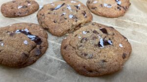 - Sprinkle the tops of the cookies with flaky sea salt. Allow to cool on the pan for 10 minutes then transfer to a wire rack to cool completely.