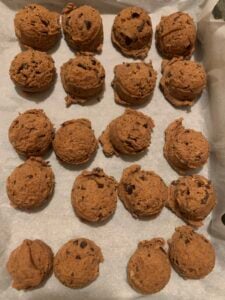 - Scoop 6 cookies (about 55g per cookie dough ball) using a 2 tablespoon cookie scoop onto the prepared baking sheet. If desired, flatten each ball of dough, press more chocolate pieces on the top, and roll into a ball (this works particularly well in this recipe). Arrange evenly apart on the pan. Keep the remainder of the batter in the bowl lightly covered with plastic wrap.