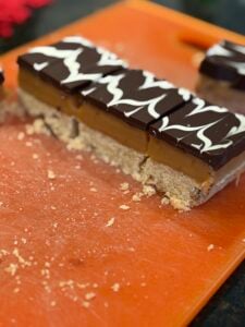 The bars taste absolutely amazing! I am finding it hard to slice cleanly through theshortbread layer. I used a hot knife but chunks keep breaking off so they arent perfect squares:(