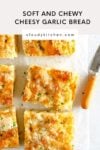 This delicious cheesy garlic bread recipe is made using Detroit-style pizza dough! The dough is no knead so it's super easy to make. While the recipe does need to rest in the refrigerator overnight, it's completely worth it - the result is ultra-cheesy and chewy homemade garlic bread that's the perfect accompaniment to any meal.