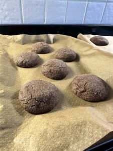 - Using a cookie scoop, scoop 2 tablespoon worth of mixture at a time (about 40g). Roll into a ball using your hands, then roll generously in granulated sugar. Place on the baking tray, leaving room to spread (I had 8 cookies per baking tray).