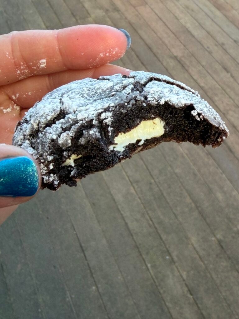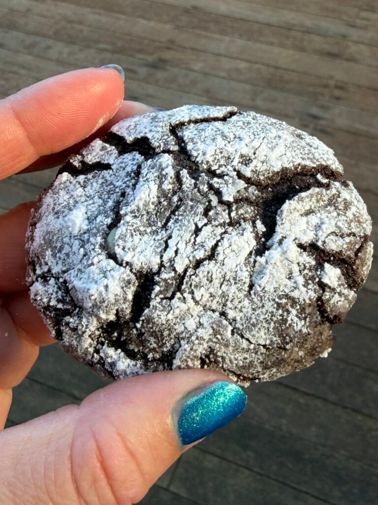 The part that makes this a 'crinkle' cookie is the generous coating of powdered sugar that the cookie dough ball gets before going into the oven. As it bakes and spreads on the baking sheet, cracks develop and are exposed, giving the perfect crackle cookie.