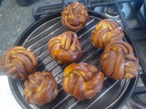 The method for making these I got from Richard Bertinet, although I have seen it a few places before too. Basically you fold the dough up, cut strips, and braid them up. The braid then gets rolled up into a twisted cinnamon bun!