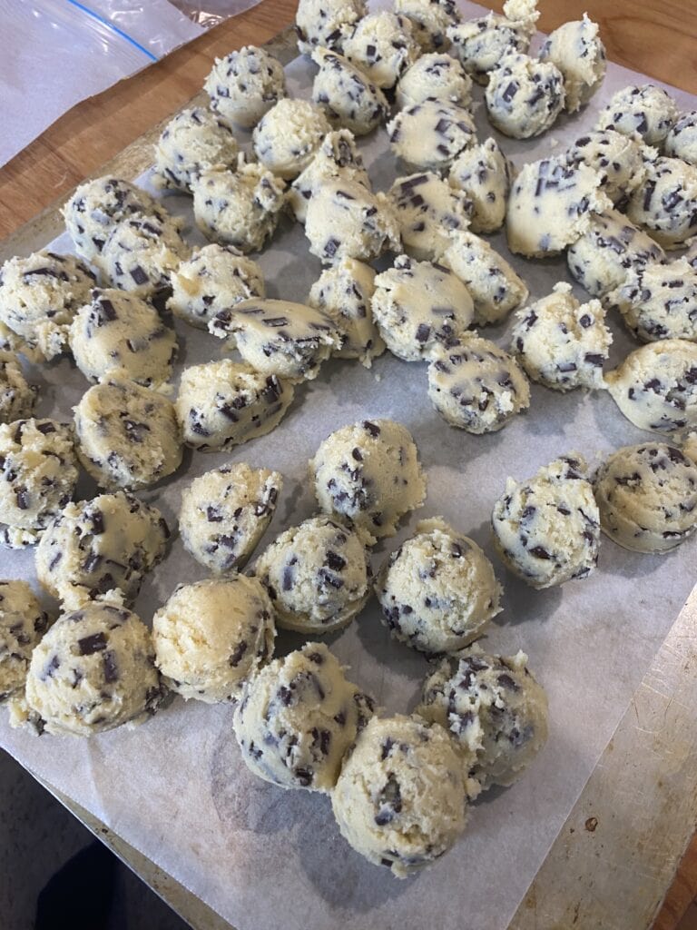 - Using a 1 tablespoon (#60) scoop, scoop 20g balls of dough onto the prepared baking sheets - I can fit 20 per baking sheet. Roll each into a ball between your hands and arrange evenly on the baking sheet.