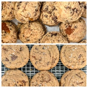 These are a riff on my Brown Butter Salted Caramel Chocolate Chunk Cookie recipe, which is super popular on my site and a great addition to our chocolate chip cookie recipe collection. The recipe has a brown butter base, then is filled with chocolate and pieces of chopped caramel.