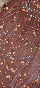 Once the brownie is baked, you add a simple chocolate icing, which comes out nice and smooth as it melts from the heat of the brownie. The whole thing is finished off with rainbow sprinkles, then goes in the fridge to chill until you are ready to serve. Super easy, and super delicious.