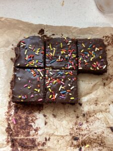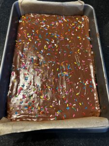 Once the brownie is baked, you add a simple chocolate icing, which comes out nice and smooth as it melts from the heat of the brownie. The whole thing is finished off with rainbow sprinkles, then goes in the fridge to chill until you are ready to serve. Super easy, and super delicious.
