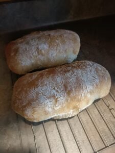 - Once the dough is risen, transfer to the oven, and bake for 18 to 20 minutes until the ciabatta is baked and golden brown and sounds hollow when tapped underneath.