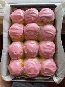 These Raspberry Iced Buns go by many names. We called them 'pink buns' growing up and they are a NZ bakery / supermarket bakery classic. I guess they first originated as a way for bakeries to repurpose bread rolls by filling them with jam and finishing them with icing. Iced buns were the ultimate after school snack.