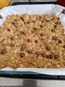 - Leave to cool in the pan, then remove from the pan using the parchment paper sling. Slice into bars using a sharp knife.