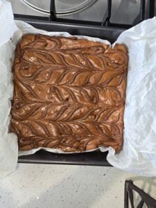 If you can't be bothered doing the fancy feathered finish feel free to just blob the rest of the Nutella onto the top of the brownie and make a nice Nutella swirl using a toothpick!