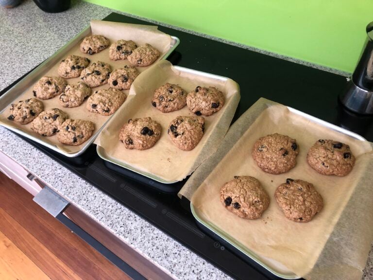 I am not a baker, at ALL, but something about these biscuits got my attention on Instagram. Let me just say that these are absolutely phenomenal and I’m so glad I followed my instincts and made a double batch. It was definitely worth the extra pans to toast the oats and brown the butter and milk powder. A few notes for my fellow baking idiots: brown the butter on medium like Erin says, I was being timid and kept the temp low and it took forever. Use a cookie scoop like Erin says or at least a couple of spoons because the mix is very firm and sticky and I thought I could/should scoop it with my hands like meatballs? Idiocy. I don’t own a wire rack so cooled them completely on the tray and they turned out fine, no soggy bottoms. I’m in Australia and used traditional rolled pats which I think is equivalent to old fashioned pats in NZ, anyway the texture was great, crisp edges and a toothsome slightly chewy middle so it has my endorsement! Excuse the terrible photos, I’m also not a photographer in addition to being not a baker. I used a combo of dried cranberries and dried tart cherries as I had no raisins so the fruit looks a little different to what you might expect. Have passed the recipe on to my mum and my sister who were lucky enough to be beloved enough by me to receive some.