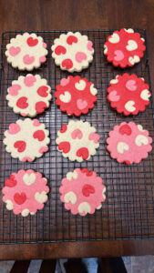 I made a double batch of the dough then divided it into three - I did half (700g) plain, a quarter (350g) I added red food colouring to (I used the oil based one from colour mill) and then the other quarter I added 15g black cocoa to. I rolled out between parchment as above for the zigzag cookies, then froze the dough and used a heart shaped plunger cutter to cut out pieces, and filled the holes in with cut outs from the other doughs. I repeated with all three doughs, then chilled them and cut out circles using a scalloped cutter. Freeze and bake as directed in the pinwheel cookie recipe.