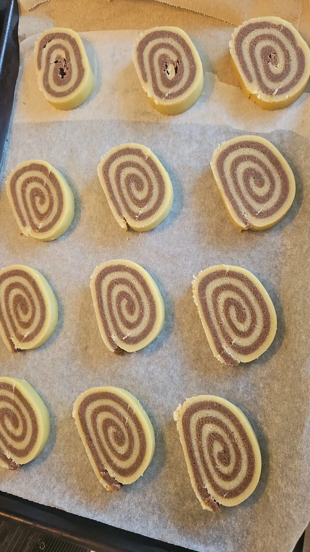 - Loosen each piece carefully from the bottom piece of parchment - leave the vanilla dough on the parchment paper.