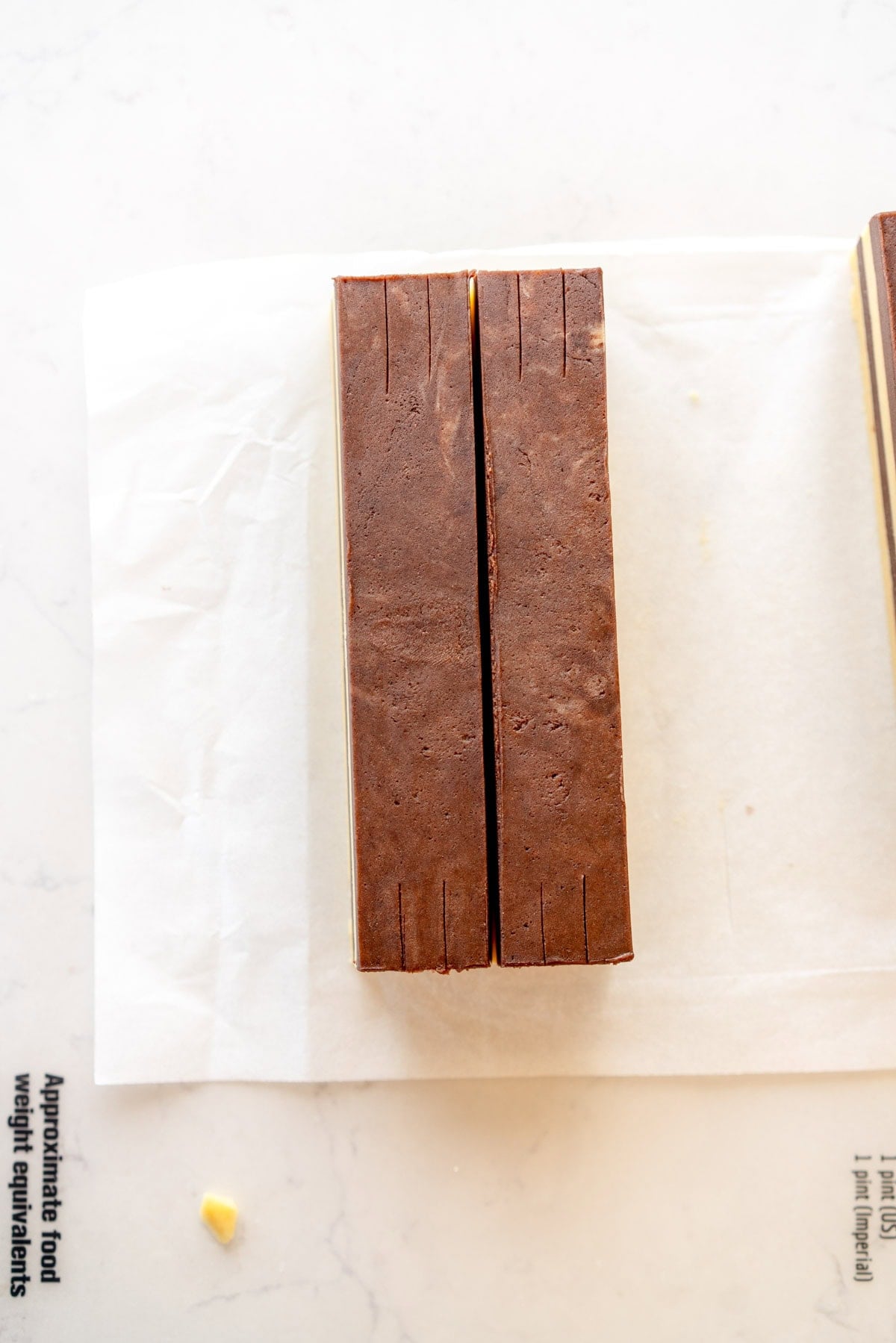 - Remove from the freezer and remove the top sheet of parchment paper from the first piece of dough. Use the piece of printer paper as your template and use a ruler to cut the dough to exactly the size of the piece of paper. Do the same with the other flavour of dough. If at any time they are getting warm, transfer them back to the freezer (make sure if you are stacking them there is a piece of parchment between them.