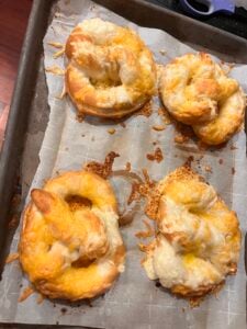 - Transfer the baking sheet to the oven and bake the pretzels for 12-15 minutes until they are baked through and the cheese on top is lightly golden brown.