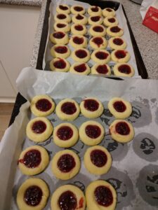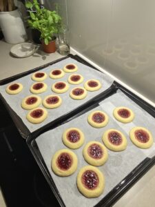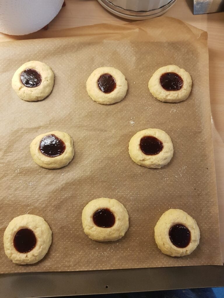When you bake the cookies they will spread slightly and the jam will become a thin puddle and thicken up. You don't want to bake them until they are super golden (Unless you like them like that), you want to bake them until they are just starting to get some colour on them.