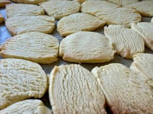 - Using a sharp knife, cut the shortbread into biscuits 1cm (0.4") thick, and arrange on the trays, leaving a little room for spreading.