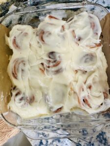 - Bake the rolls for 25 to 30 minutes, or until deeply golden brown. Remove from the oven and allow to stand for 15 minutes or so before icing with the cream cheese frosting.