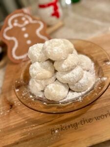 Snowball cookies are essentially a super buttery shortbread dough, which is scooped into balls and then baked, and then rolled twice in powdered sugar.